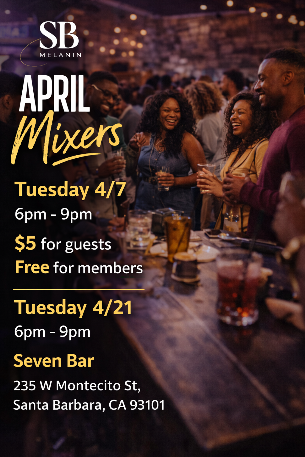 Don’t miss out on SB Melanin’s monthly mixers — where connection, culture, and good vibes come together. Twice a month, we gather to unwind, network, and celebrate community in a space that feels like home. Enjoy great music, conversations, and laughs with Santa Barbara’s Black community and allies.